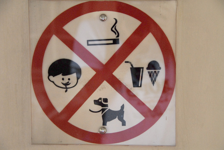 No smoking, food or drink, dogs on leashes, children with cleft palettes(?)